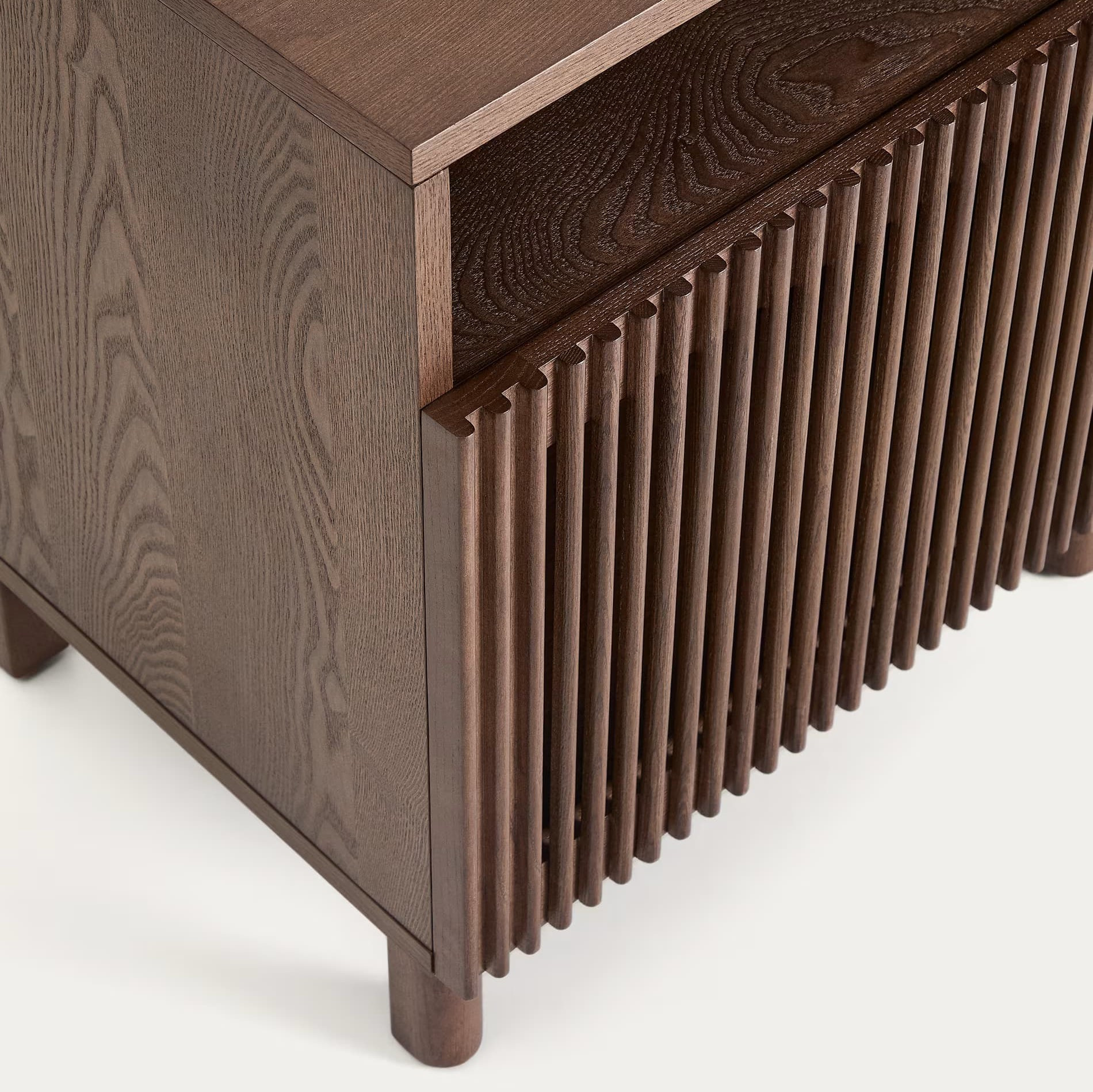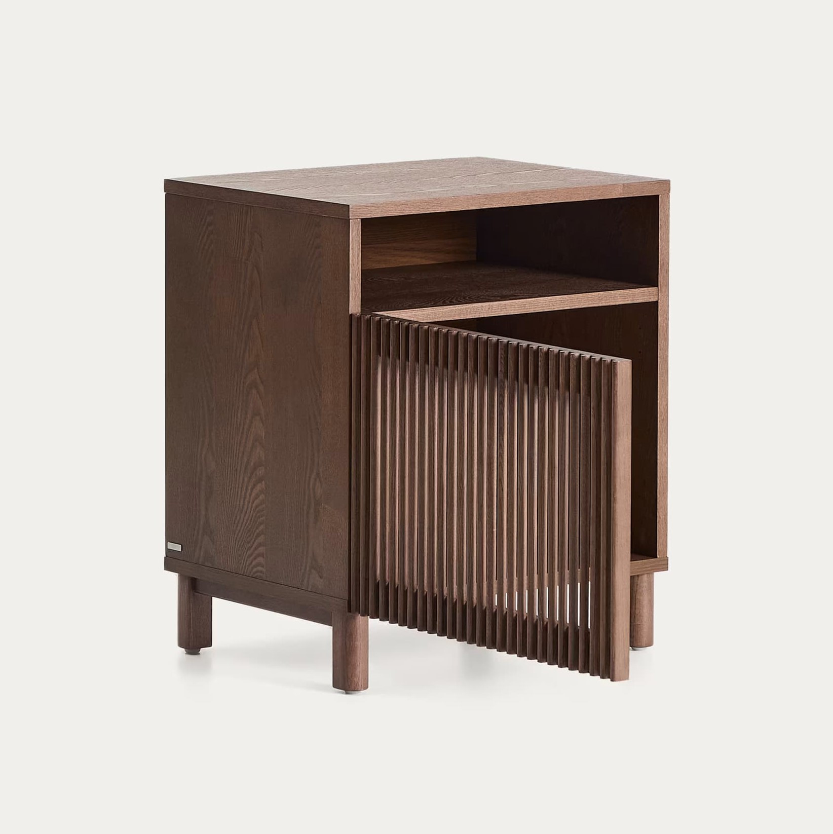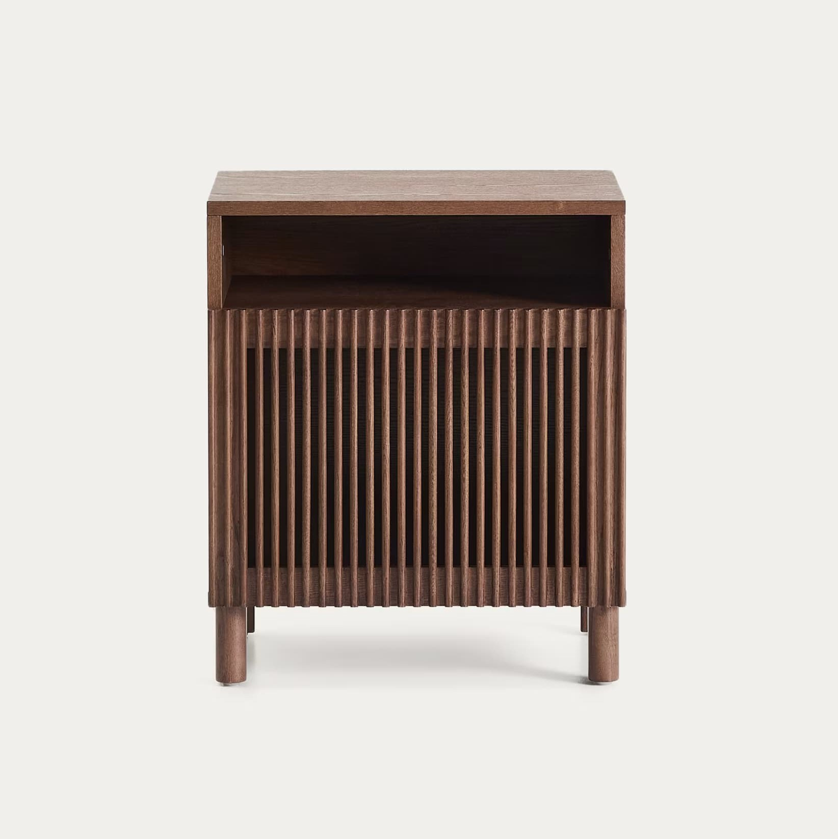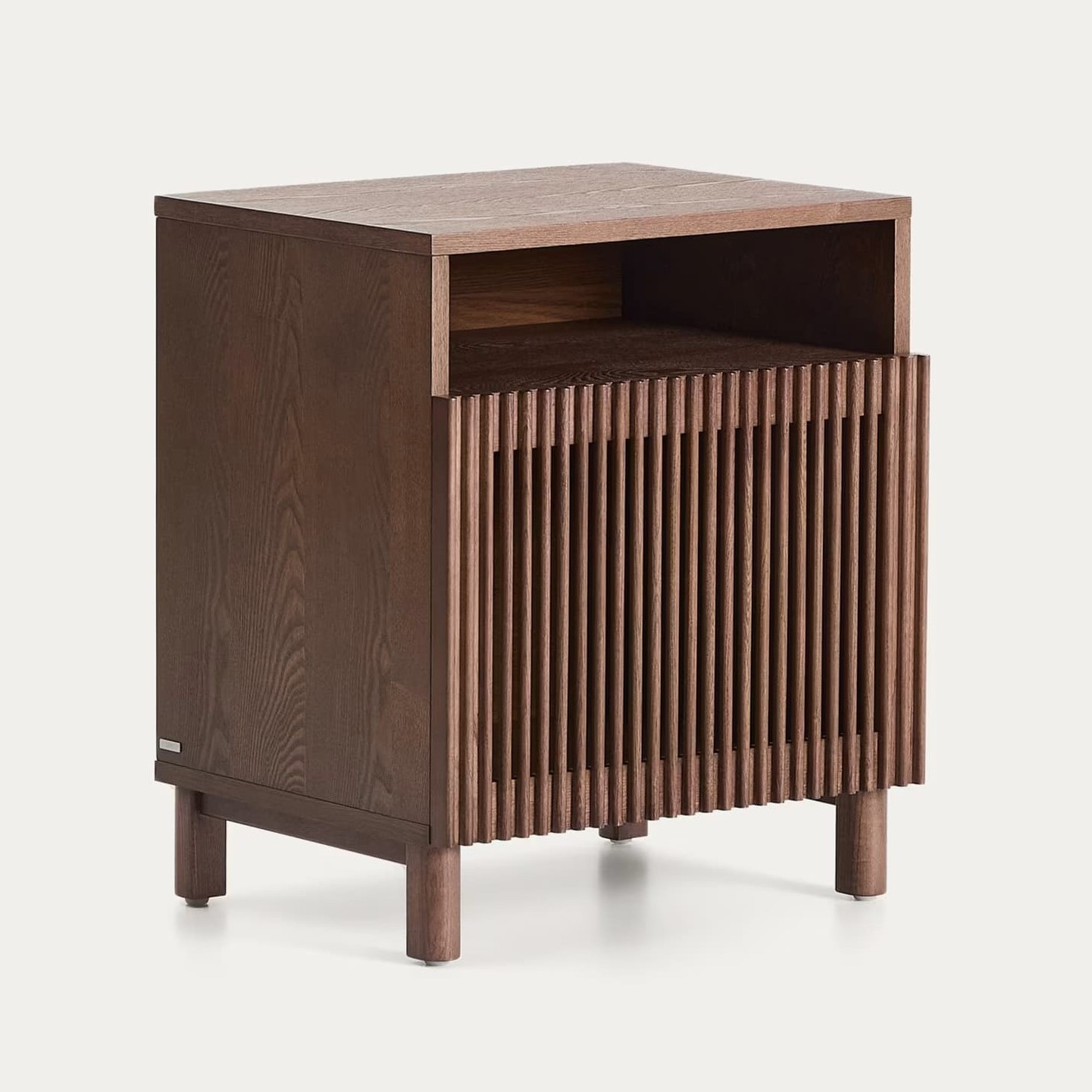 Night cabinet Beyla Kave Home is an elegant piece of furniture that combines functionality with a timeless style. Made of veneer and solid wood, in a nut shade it brings heat and character to the bedroom. Its front is decorated with vertical strips that create subtle contrasts of light and add lightness to form. Equipped with 1 door with a soft closing system, provides comfort and quiet work, and adjustable legs guarantee stability even on uneven ground.