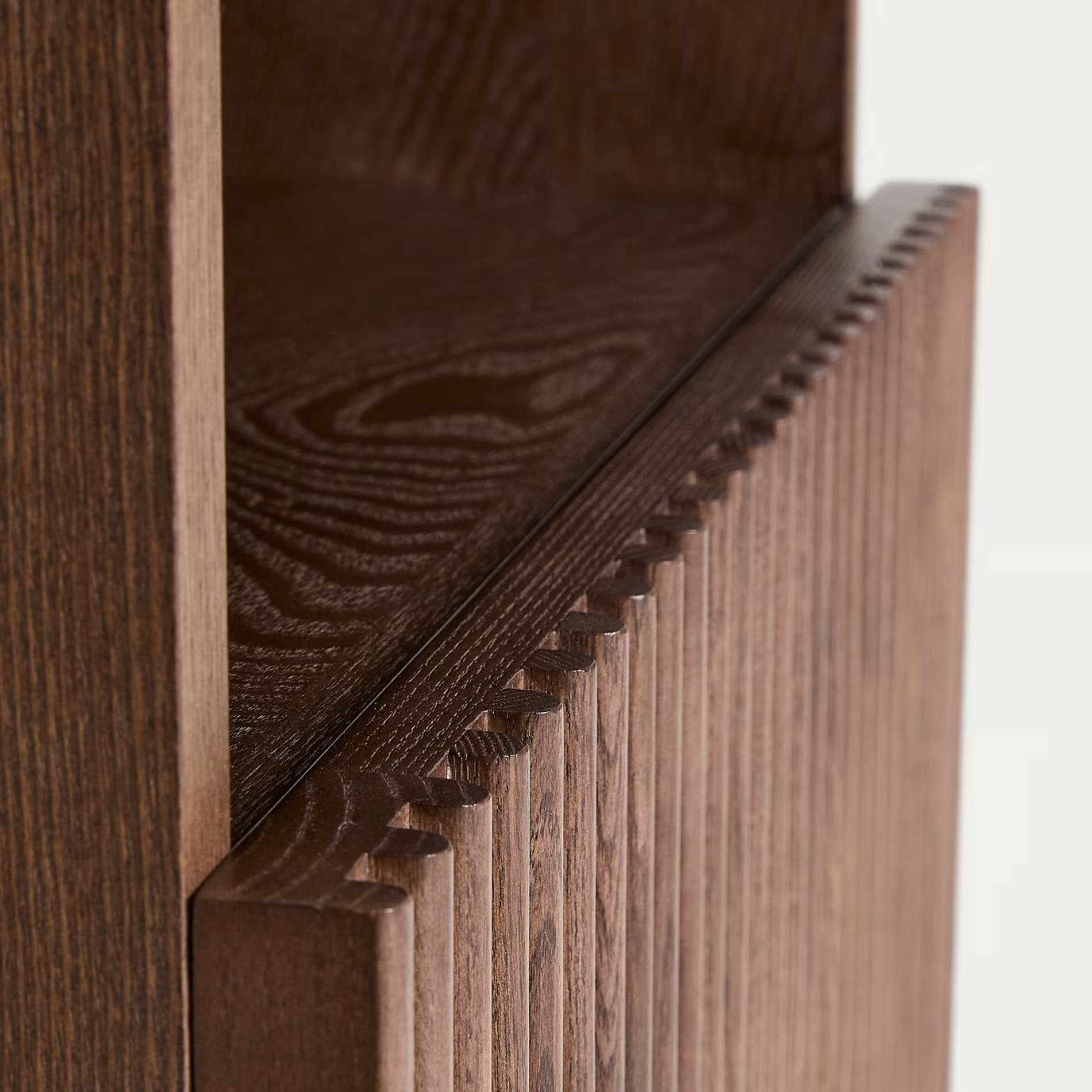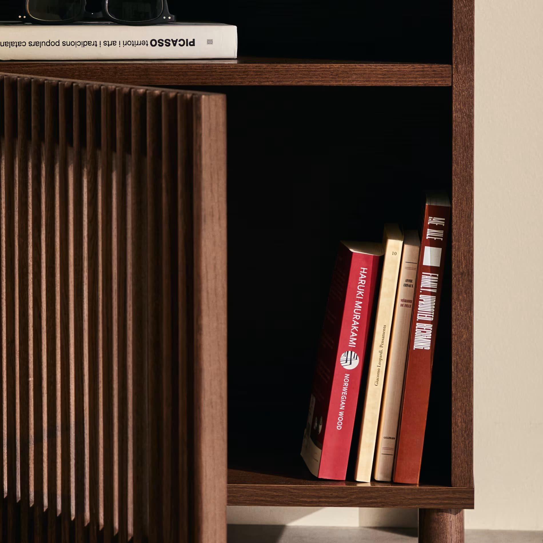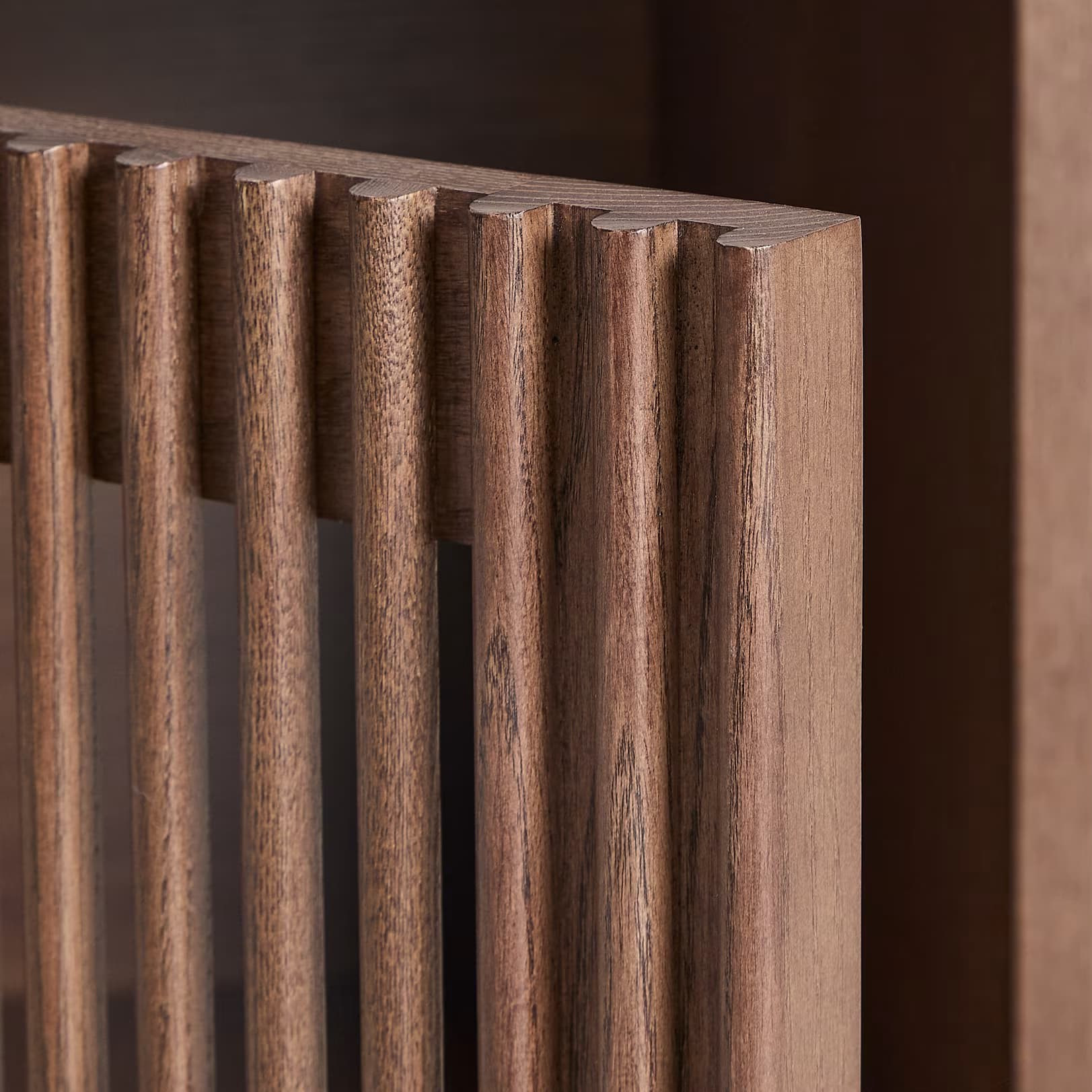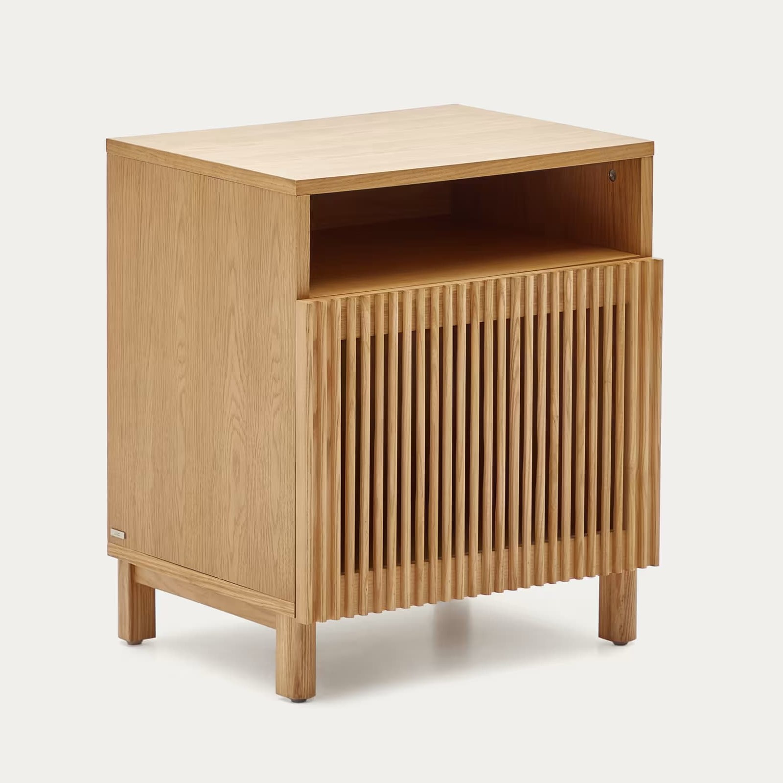 Night cabinet Beyla Kave Home is an elegant piece of furniture that combines functionality with a timeless style. Made of veneer and solid wood, in a nut shade it brings heat and character to the bedroom. Its front is decorated with vertical strips that create subtle contrasts of light and add lightness to form. Equipped with 1 door with a soft closing system, provides comfort and quiet work, and adjustable legs guarantee stability even on uneven ground.