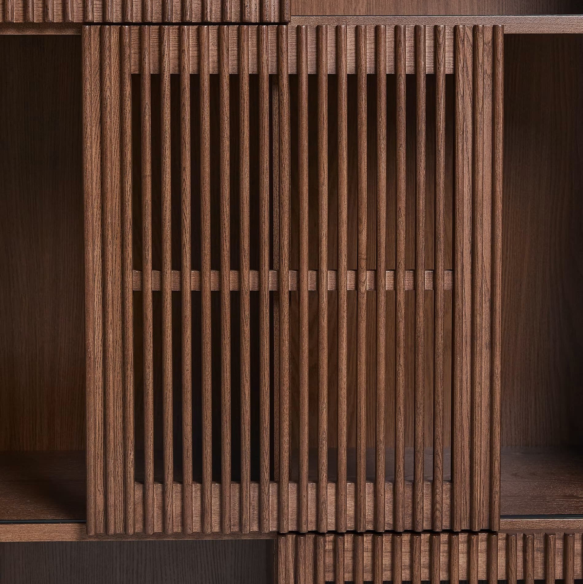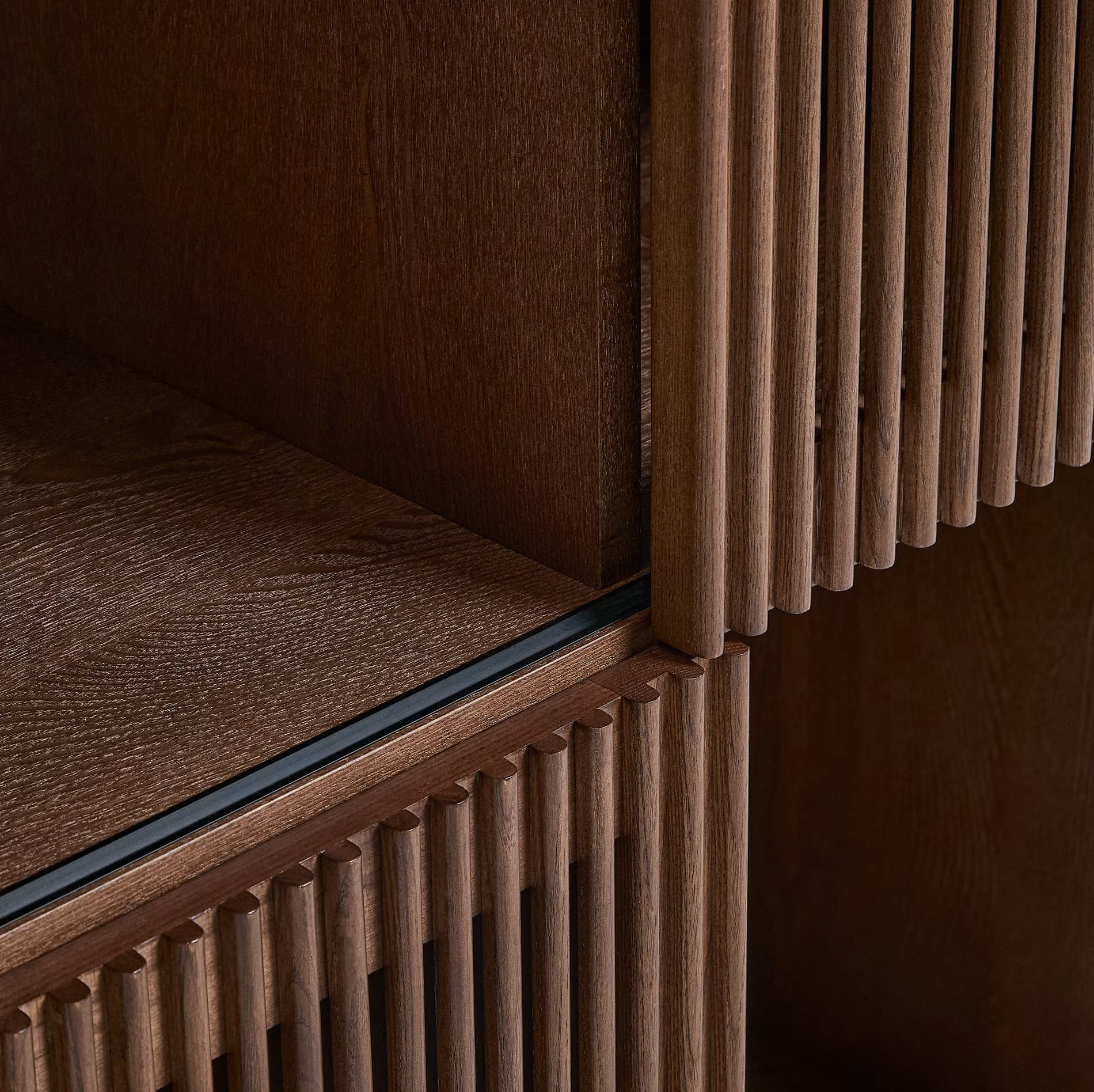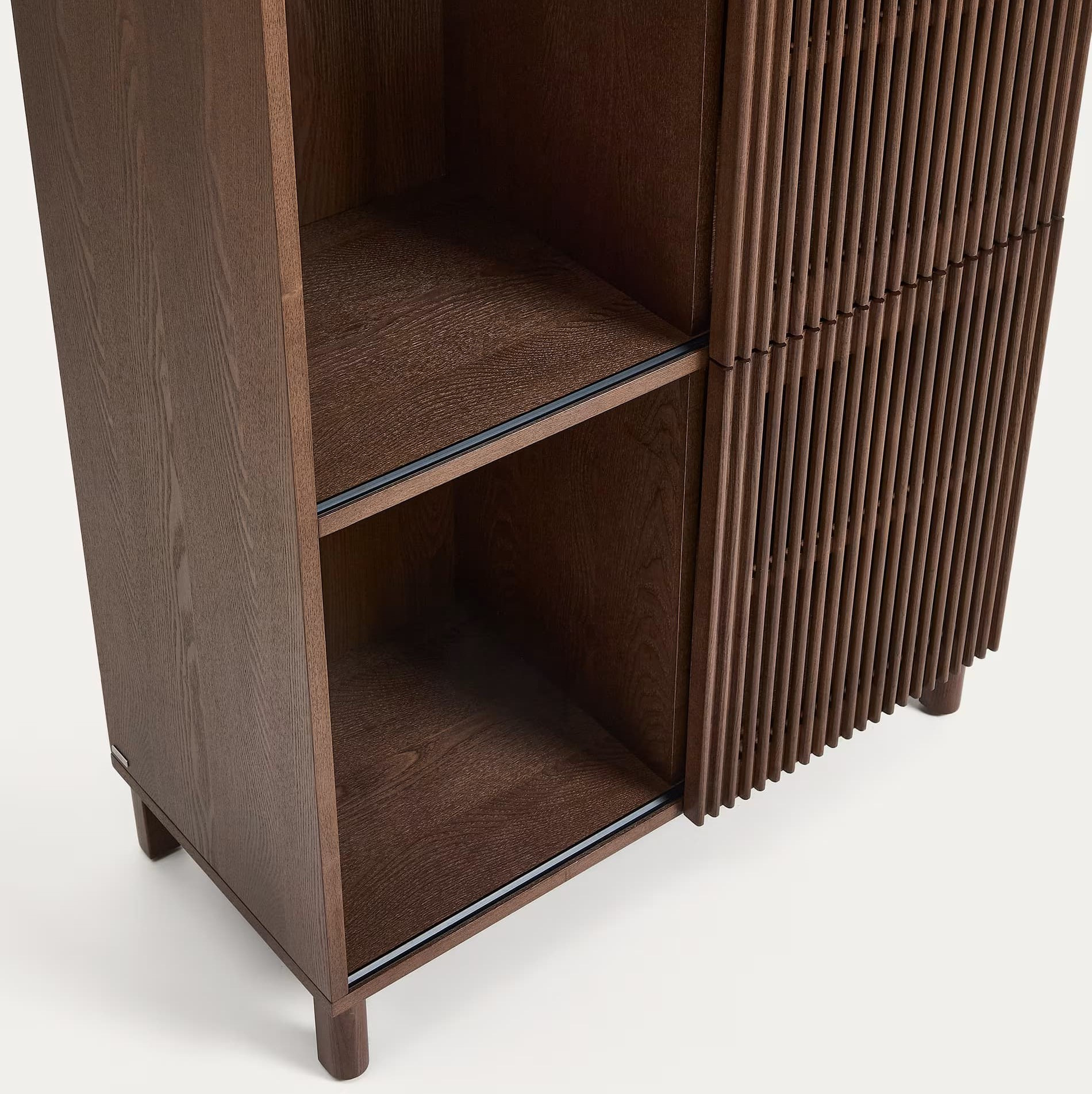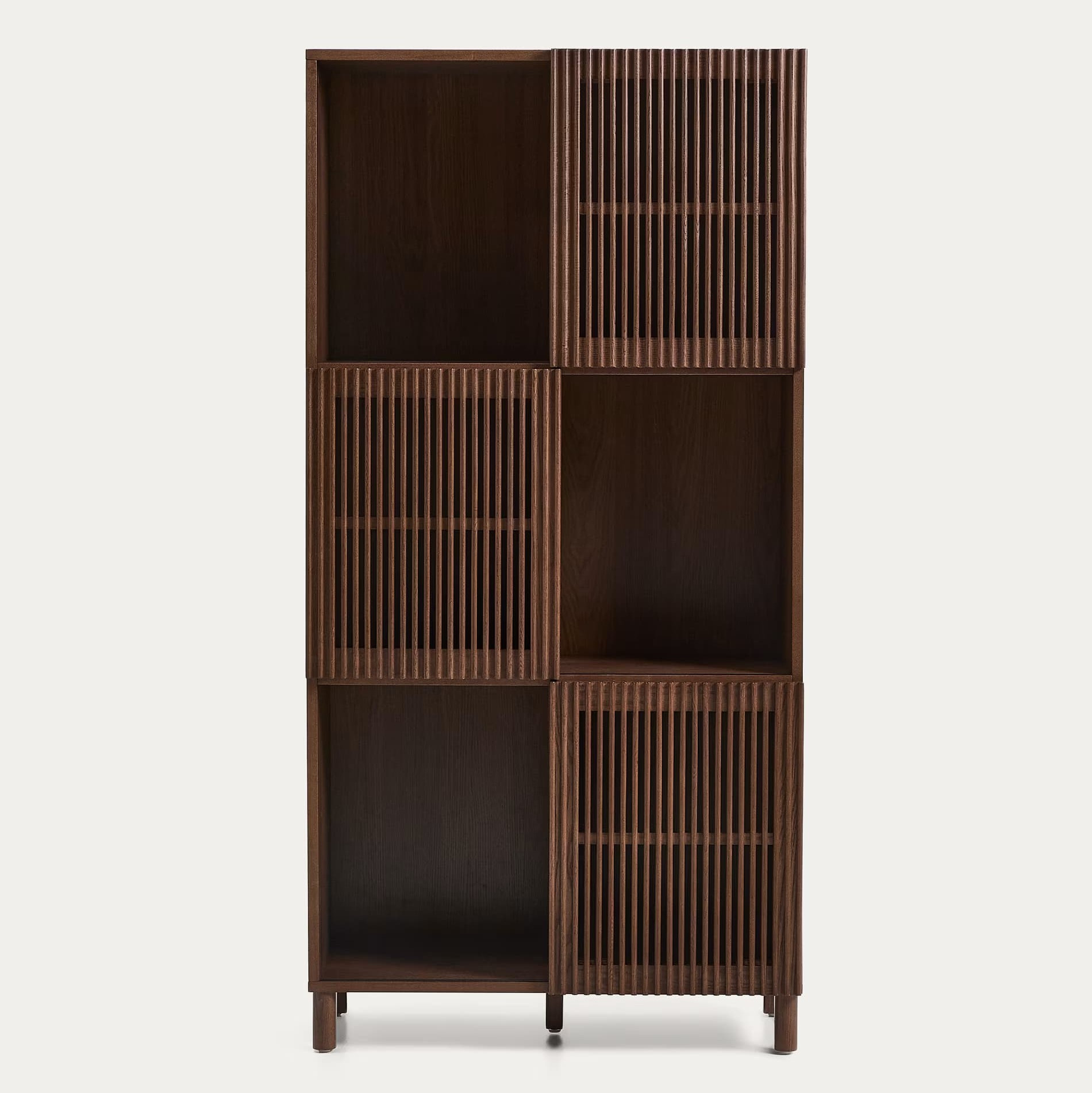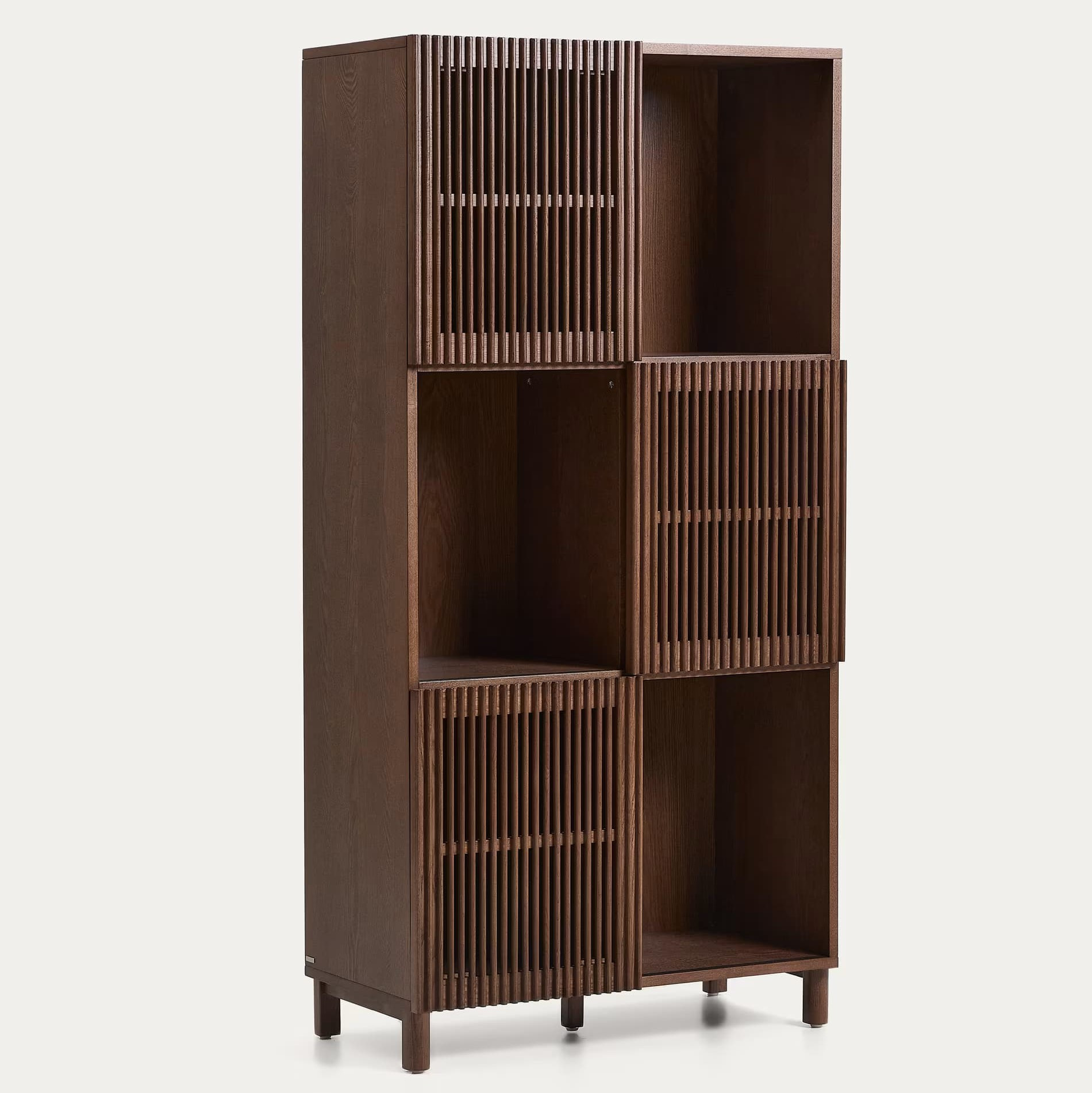 Beyla bookcase Kave Home is an elegant piece of furniture that combines the natural beauty of wood with modern design. Made of ash veneer and solid wood in a nut finish, it introduces heat, depth and character into the interior. The characteristic vertical strips on the fronts create subtle contrasts of light, giving the rack exceptional lightness and rhythm.