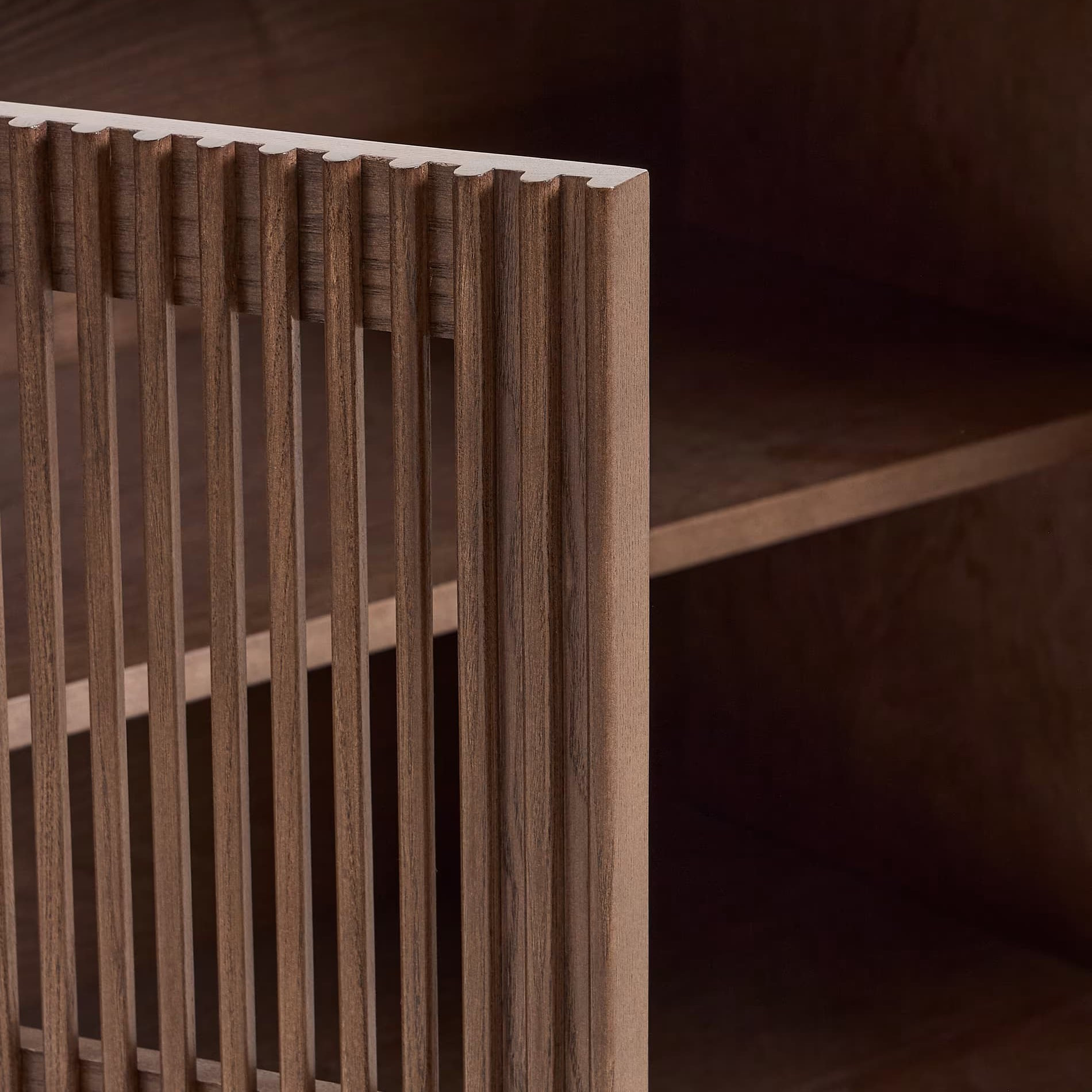 Beyla chest of drawers brown/nut combines the natural elegance of wood with original vertical strips on the door, which create a subtle play of light and shadows. The body was made of veneer in a shade of walnut/brown, and solid legs made of solid wood were protected with varnish, which guarantees durability and stability. The door is equipped with hinges with a soft-close system that increase the comfort of everyday use.