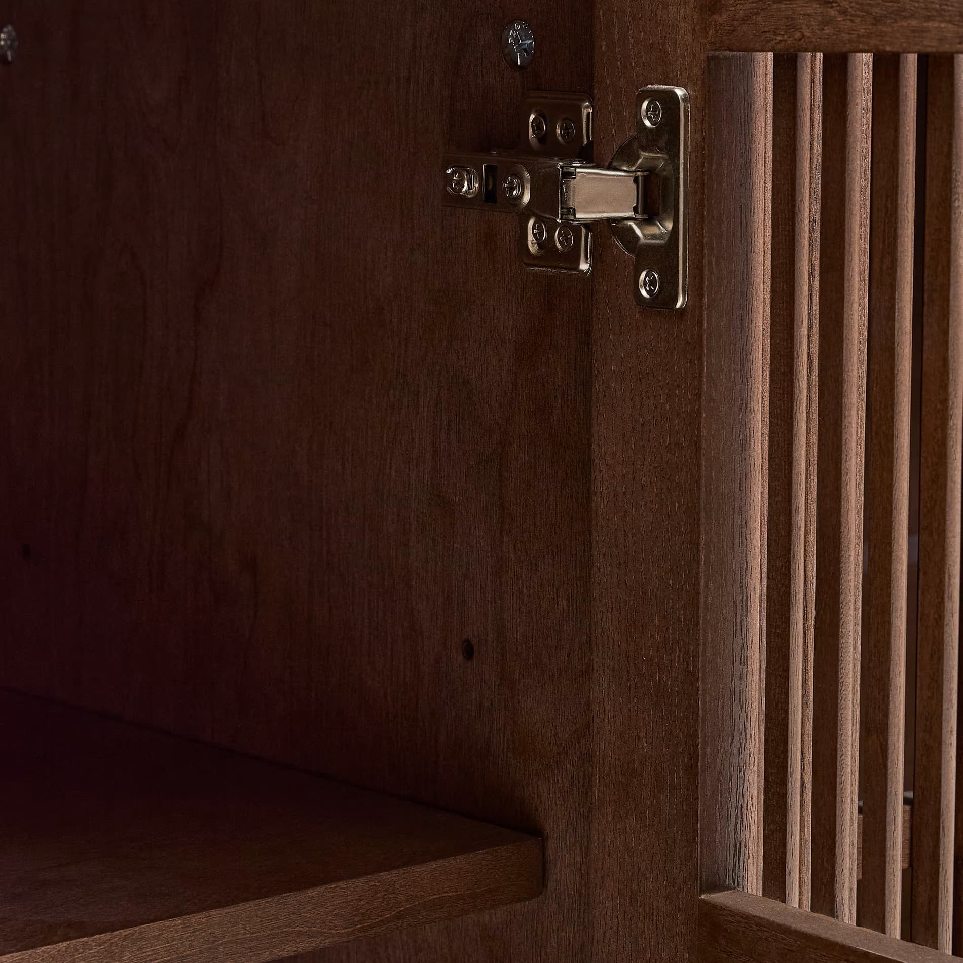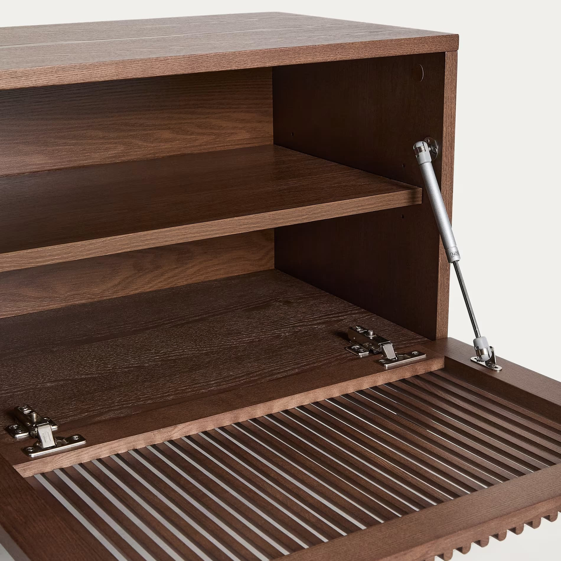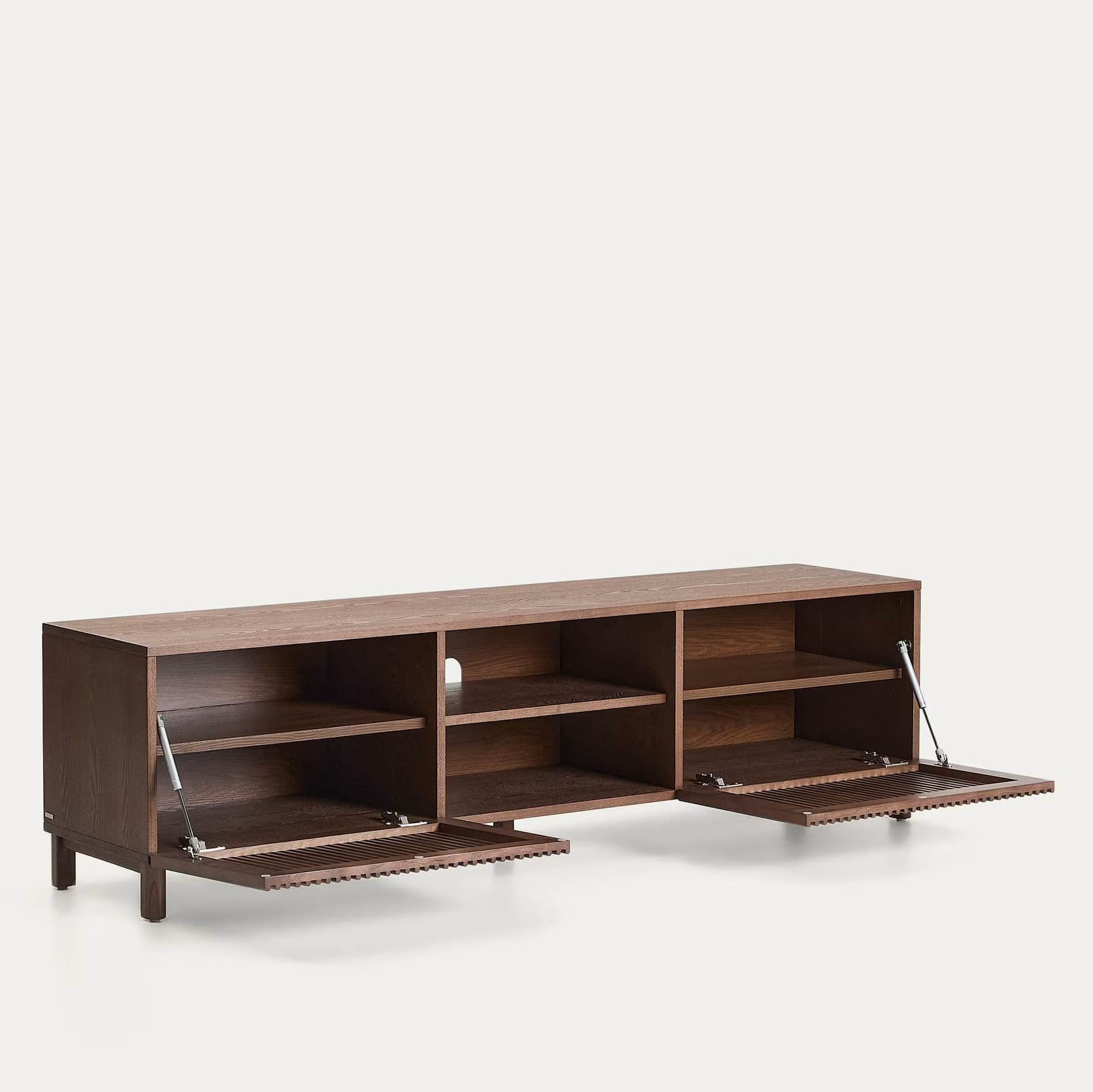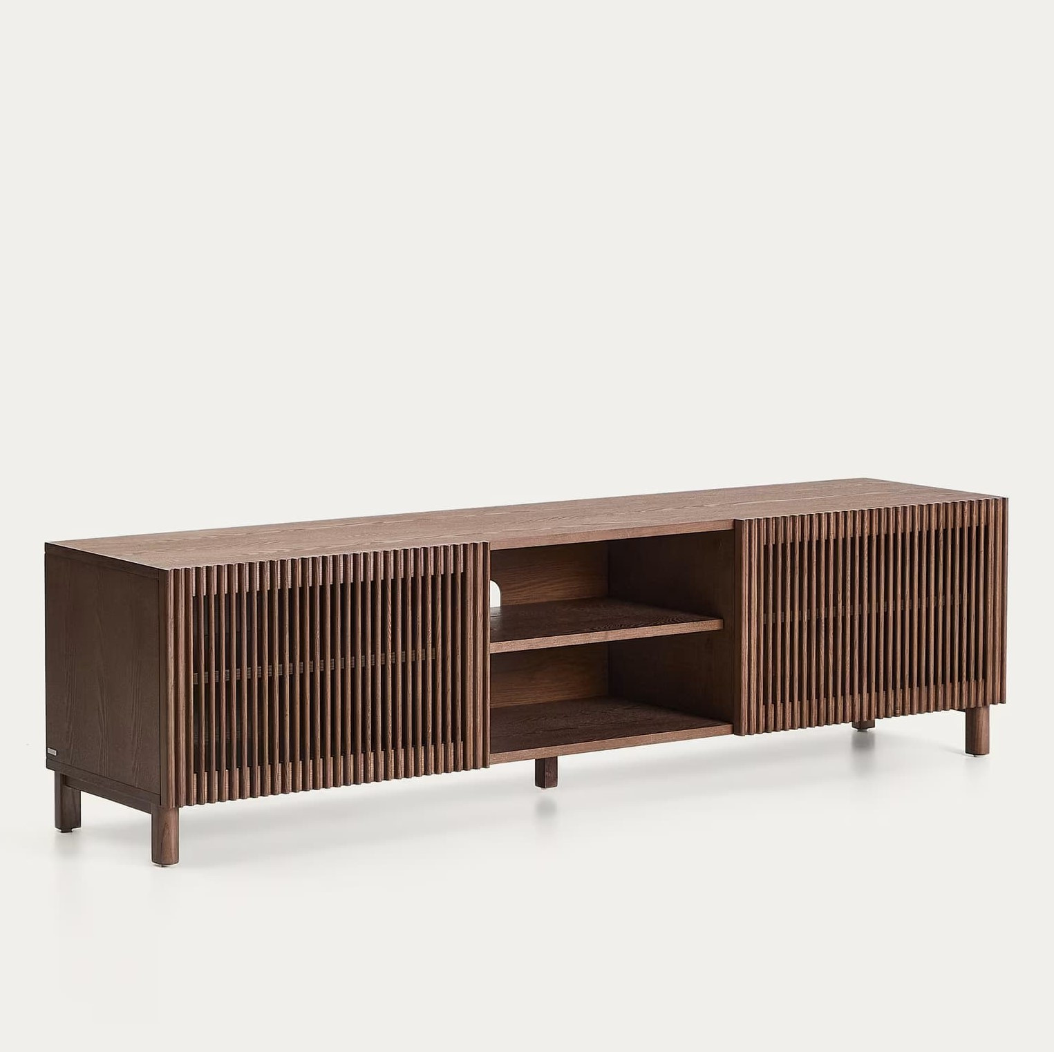 TV cabinet beyla Kave Home is a combination of elegance and functionality, created for modern interiors. Made of solid ash wood and oak veneer, finished in a shade of walnut, impresses with its timeless aesthetics and precise performance. The characteristic vertical lines on the fronts give it depth and lightness, and the sliding door hinging hides a spacious interior with adjustable shelves that you adapt to your needs.