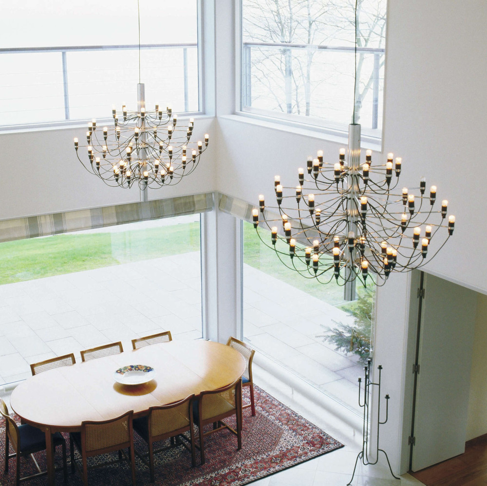 Flos 2097/50 is an iconic hanging lamp, designed in 1958 by Gino Sarfatti. Lamp frame made of steel bars with a chrome finish. The lamp's arms are slender and spread out around the central shaft.