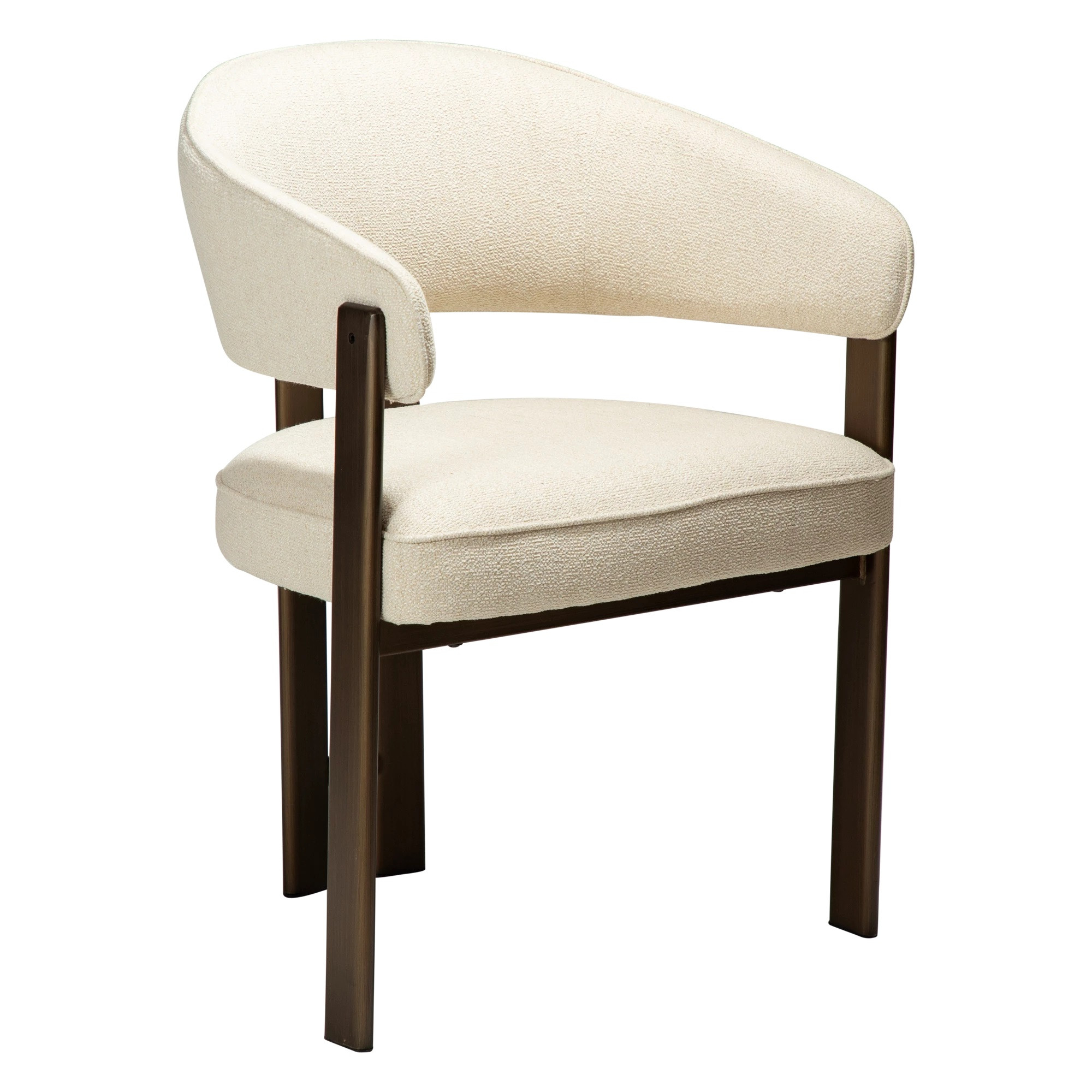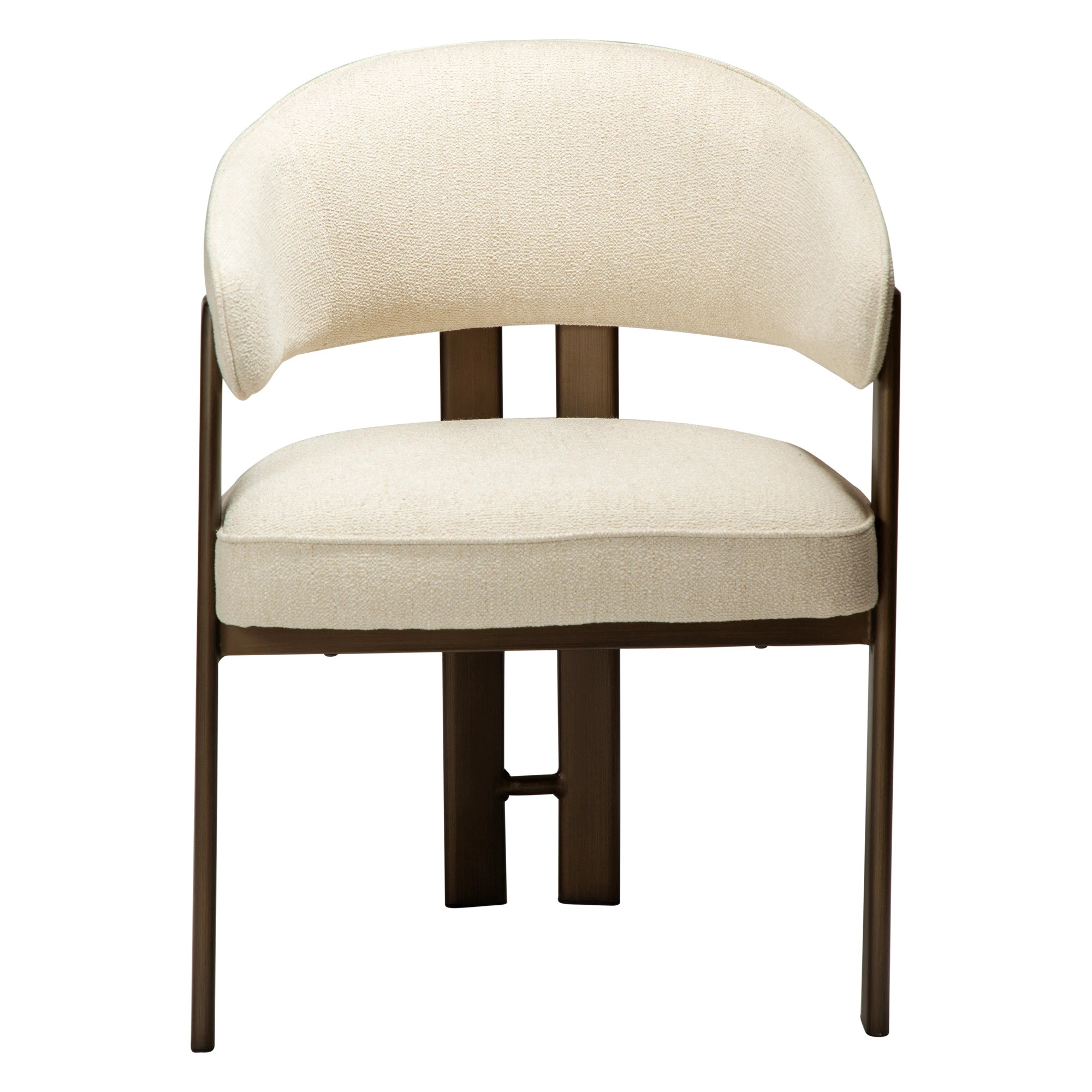 The seat and backrest are made of bent plywood, filled with foam, which ensures comfort and stable support. The upholstery in light beige bouclé fabric with a soft, looped structure gives the furniture a cozy character. The whole thing is mounted on metal legs finished in antique brass.