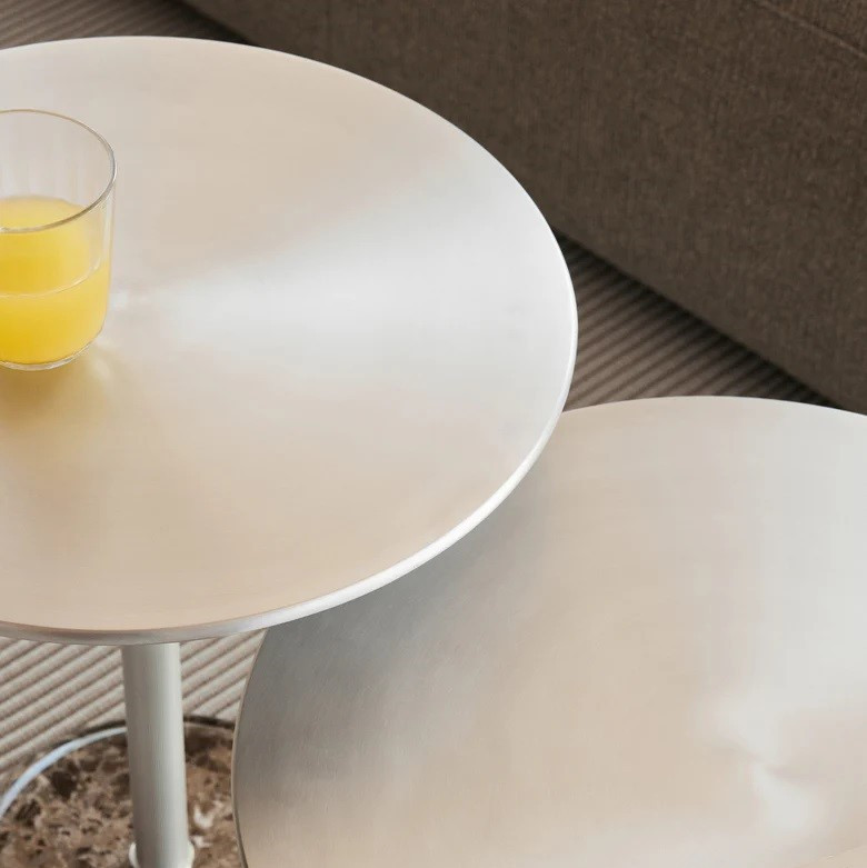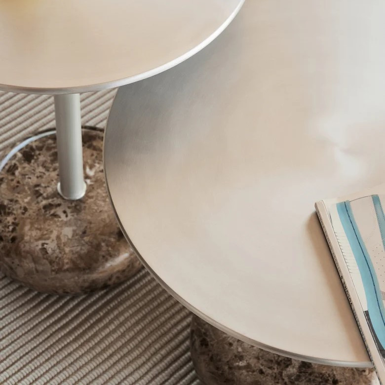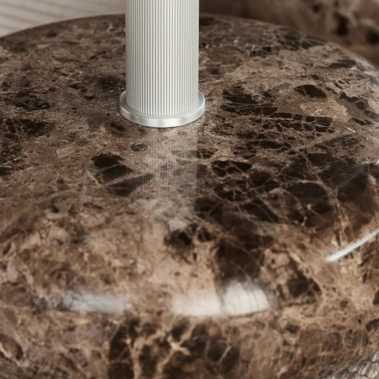 The Ton occasional table is a sculptural interpretation of nature enclosed in a minimalist form. Designed in 2023 by the Berlin studio Böttcher & Kayser for Northern, it combines organic inspirations with the precision of contemporary design. The form of the table refers to stones smoothed by water and the horizon line - motifs that create its visual lightness despite its solid construction. The base made of dark Emperador marble provides stability and visual weight, contrasting with the delicacy of the brushed aluminum countertop surface. Thanks to tEmu the design also functions asa marble tablewith a clearly sculptural character.